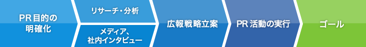 お客様の目指すゴールを明確にしたうえで課題や問題点を洗い出し、お客様とディスカッションしながら最適な広報戦略を立案します。社会の動向やニーズを把握した上で、何が価値なのかが伝わるメッセージを構築し、ターゲットへ的確にアプローチします。